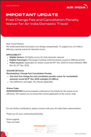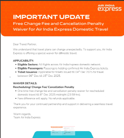 Circular No. 162- (AI & AIX) Free change fee and cancellation penalty waiver on Domestic Travel Upanshu Harit December 09, 2025 04:58 Updated Related to Circular No. 162- (AI & AIX) Free change fee and cancellation penalty waiver on Domestic Travel Related articles Etihad Airways Sales Communications - Reminder: Critical Contact Information for a Smooth Etihad Airways Experience Ethiopian Airlines India Ticketing Policy on travel with Two Separate one way tickets Comments 0 comments Please sign in to leave a comment.
