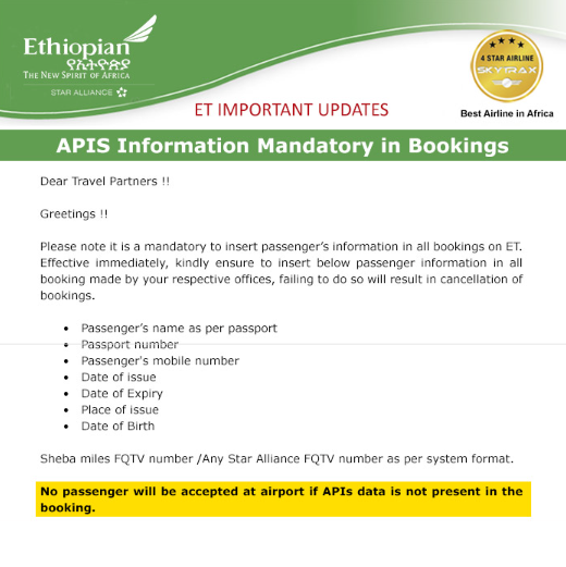 APIS Information Mandatory On Ethiopian Airlines Upanshu Harit December 12, 2025 06:07 Updated Related to APIS Information Mandatory On Ethiopian Airlines Comments 0 comments Please sign in to leave a comment.