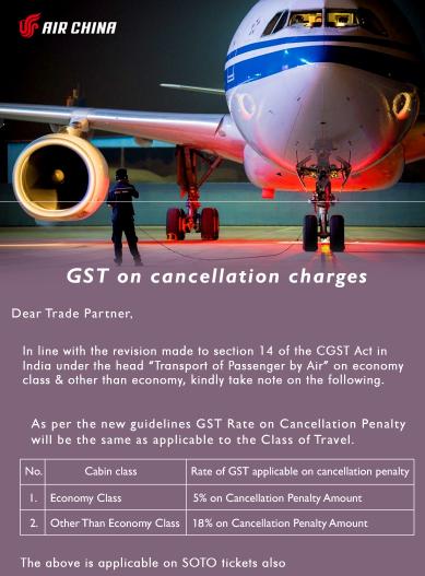 Air China: "GST on Cancellation Charges" Upanshu Harit December 12, 2025 11:12 Updated Related to Air China: "GST on Cancellation Charges" Related articles Circular No. 162- (AI & AIX) Free change fee and cancellation penalty waiver on Domestic Travel Comments 0 comments Please sign in to leave a comment.