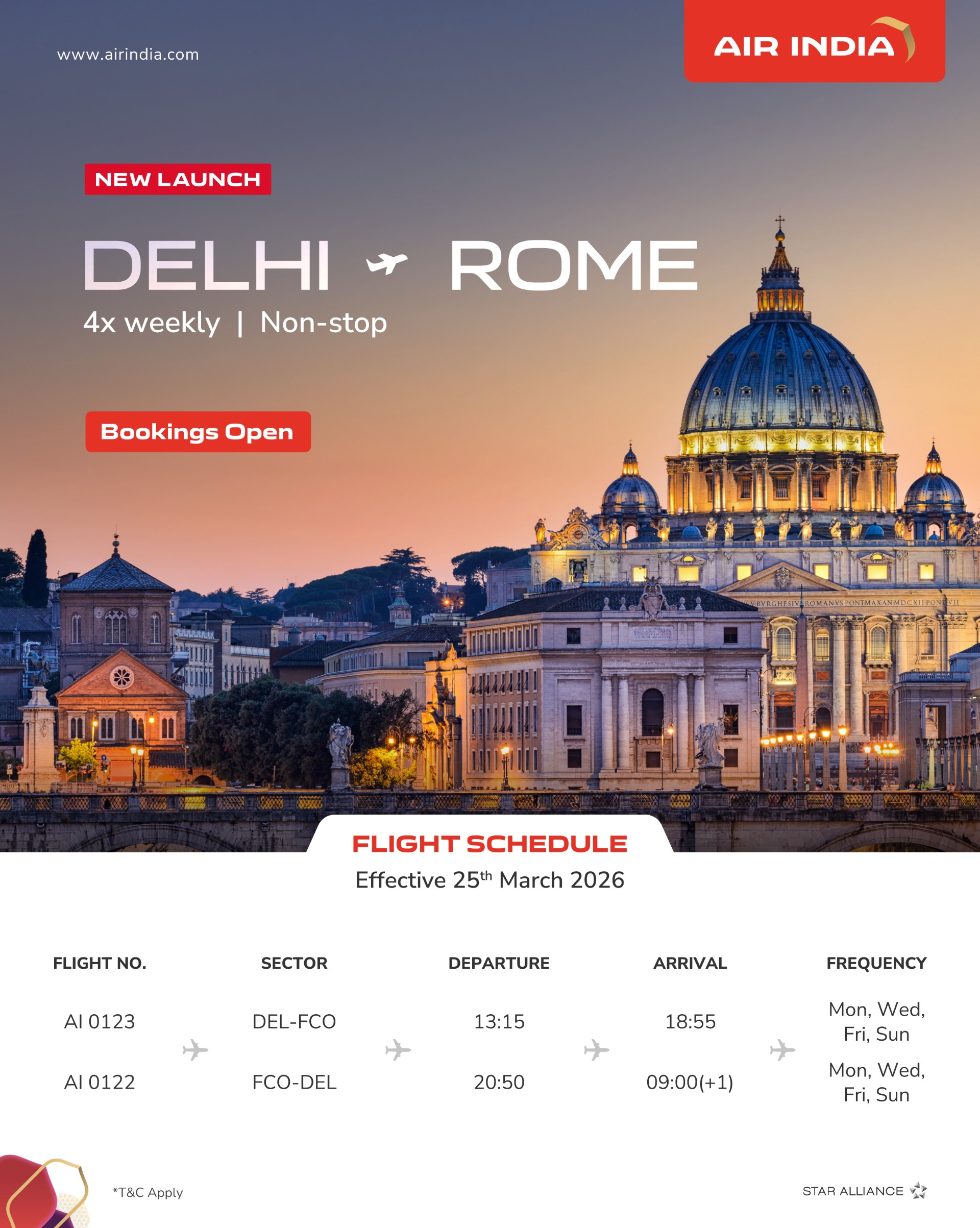 We are pleased to announce the launch of a new route from Delhi to Rome, starting operations on 25th March 2026.