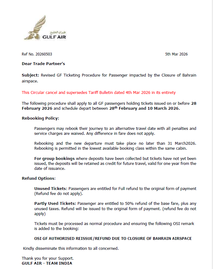 Gulf Air -Revised GF ticketing procedures for passengers impacted by the closure of Bahrain airspace- 05MAR2026 Upanshu Harit March 05, 2026 05:45 Updated Regards, Shishier Sharma. Shishir Sharma Sales Executive T:+911 43939301 M:+919711060711 gulfair.com Related to Gulf Air -Revised GF ticketing procedures for passengers impacted by the closure of Bahrain airspace TB1228_Trade Circulation.pdf 200 KB Download Comments 0 comments Please sign in to leave a comment.