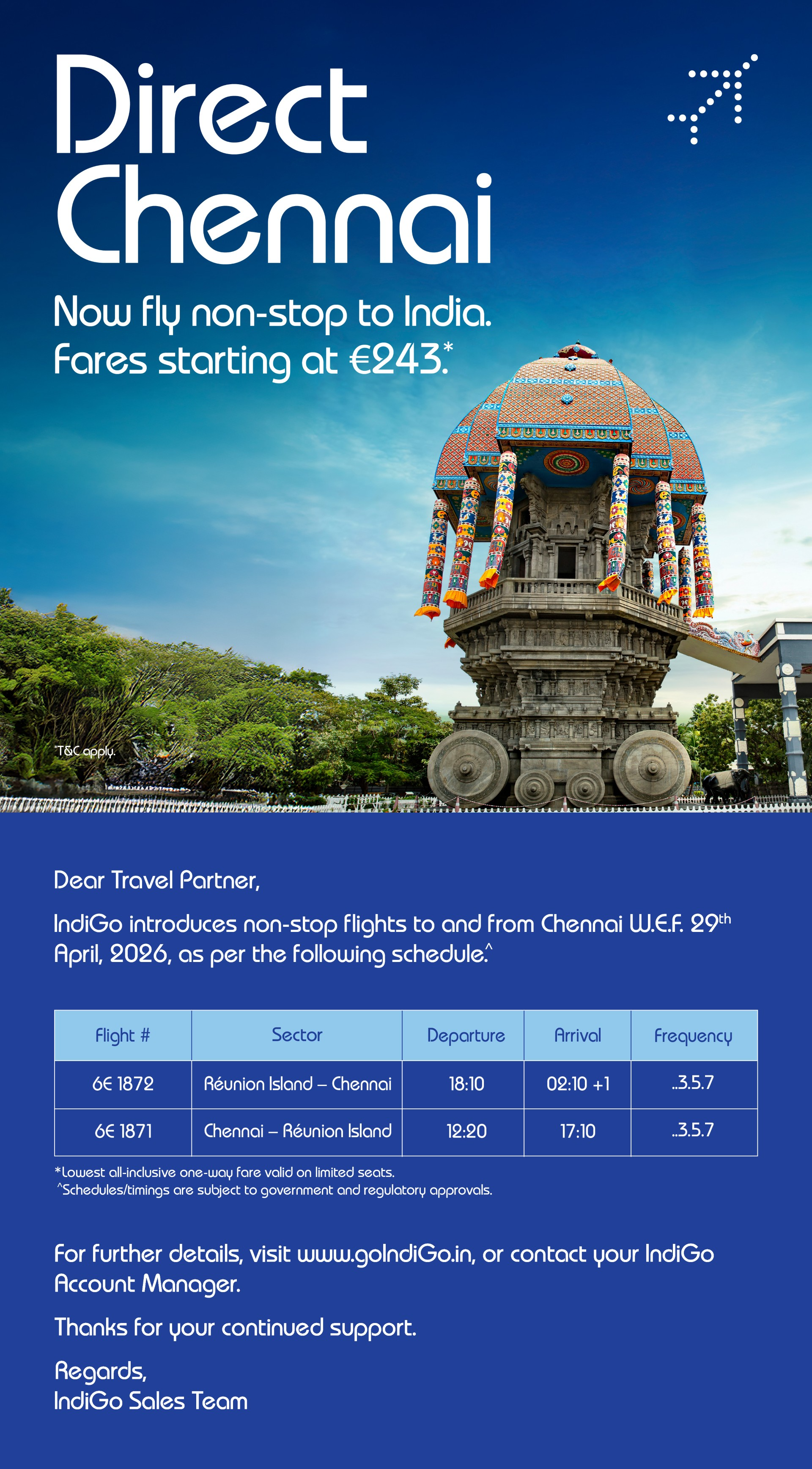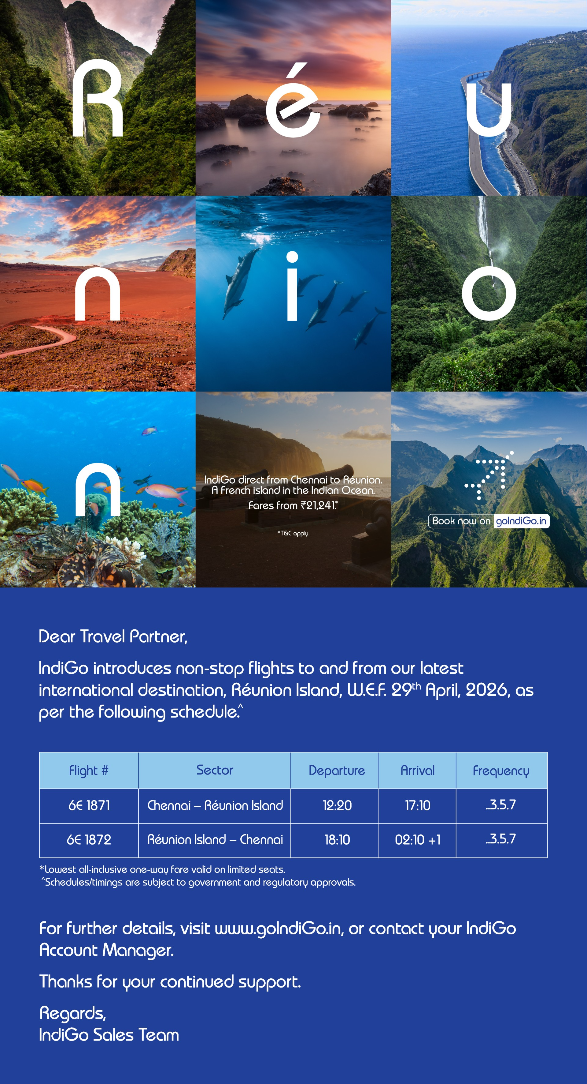 IndiGo is delighted to announce the opening of sales for our newest international connection: direct flights between Réunion Island (RUN) and Chennai (MAA). Effective 29th April 2026, we will operate 03x weekly flights, connecting India with one of the world’s most stunning island destinations—home to towering volcanoes, UNESCO-listed natural marvels, and a unique blend of cultures.