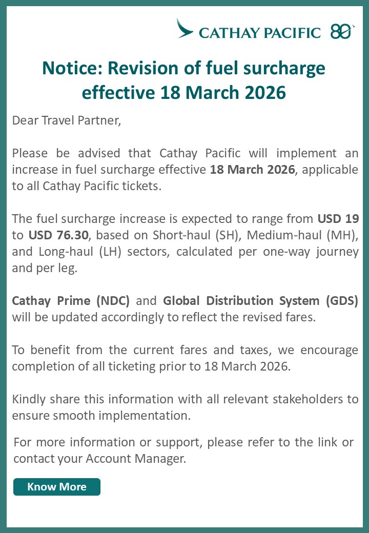 Please be advised that Cathay Pacific will implement an update to the fuel surcharge effective 18 March 2026, applicable to all Cathay Pacific tickets.