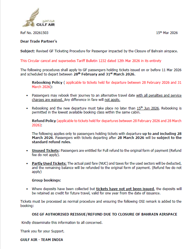 GF ticketing procedures for passengers impacted by the closure of Bahrain airspace-1234-15MAR2026 Upanshu Harit March 16, 2026 04:56 Updated Regards, Shishier Sharma. Related to GF ticketing procedures for passengers impacted by the closure of Bahrain airspace-1234-15MAR2026 TBN #1234 _15032026_Trade Circulation.pdf 300 KB Download Comments 0 comments Please sign in to leave a comment.